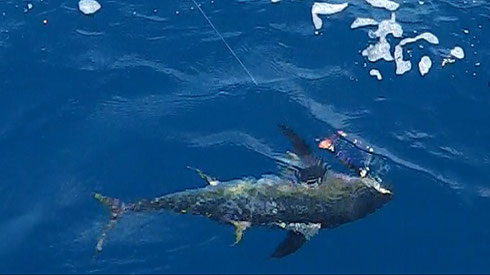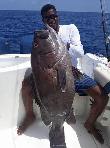 No lack of Jobfish and the other smaller stuff but about the only good catch within the first couple of days was this admittedly hefty Grouper of 42kg.The Yellowfin Tuna provided some variety turning up here and there but most of the time only briefly so topwater fishing for them was not really consistent. Thus it was not long faces but without the Amberjacks and Doggies neither real excitement as far as the jigging was concerned. On the 19th though Venture reported a great day`s catch of exactly these sought after prospects.