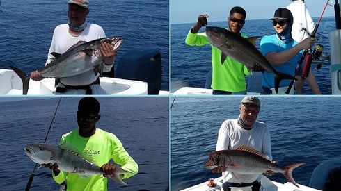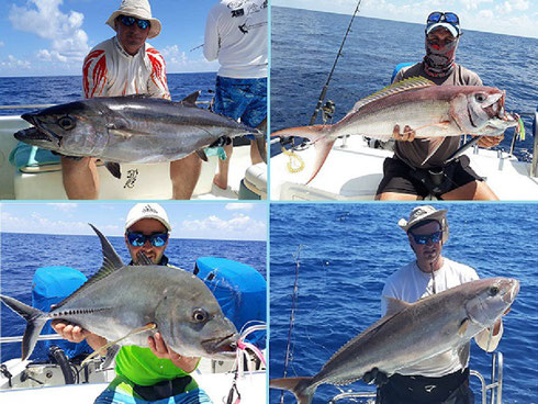 Meanwhile Mervin kept on jigging with repeater German guest Herbert and his son Marco. That particular area at the northwest Drop Off continued to produce and also a bit southwards round the corner fishing was first class. On the 28th though when I tagged along we started a bit further west and it was slow. Moving eastward we got Doggies, Amberjacks and the other usual stuff again but not in the sizes and numbers as before. Was blistering hot without wind that day which might have played a role and every single of the 30 or so fish had to be worked hard for.