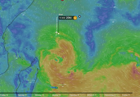 Since last Sunday and as indicated by the forecasts the wind had been picking up and is blowing at 20 knots these days. Reason is a Cyclone building up in the South that works like a vacuum cleaner creating this late northerly blow.