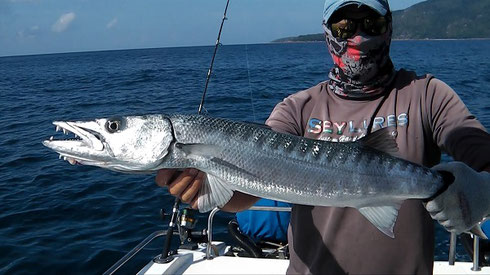 The day before I had also tagged along with Mervin. This was for popping on the plateau with Finnish angler Markku. The outcome was two Dorados and a tail hooked Garfish on Stickbaits but only a smaller GT showed along that day. Another half day for Markku with this time Greg on Aquatic Dream did not develop much better with a Shark raised and underneath that one a silver GT silhouette turned away. Thus the only catch of that trip was eventually this Greater Barracuda caught by Greg.