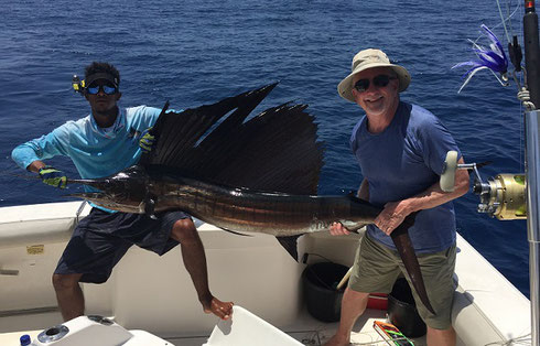 A little later we siwtched to trolling for the last few hours and that worked reasonably well: two Sails raised and despite these were only window shopping it was good news as they had been pretty much invisible here for the last few weeks. Another Tuna, a Dorado and three Wahoos ended up in the fishbox so this way Mario at least got a little taste of some of our many different fishing options and was happy with the overall experience.