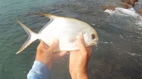 Not a big fish but great fun on the light gear. At twice the weight those will be a real job and at twice the length definitely trouble. Can`t wait for that. In the bay off my place the water is still quite murky but for a few days it cleared a bit and revealed that those Permit often feeding on a particular rock have grown substantially. The largest one of the bunch is now close to 60cm and thus a proper target. A first attempt got me there half way.