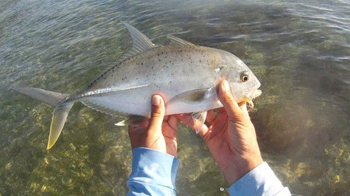 Also those Queenfish roaming the area every so often became visible again and remain another task. So far their only reaction was to bolt away but this time one followed twice which gives me a bit of hope. Two Bonefish though were not at all convinced by my service or offer while small fish came plenty as usual for everyone. Also spin anglers did well here recently. Oliver still familiar from the last report was nice enough to send a few pics of his catches.